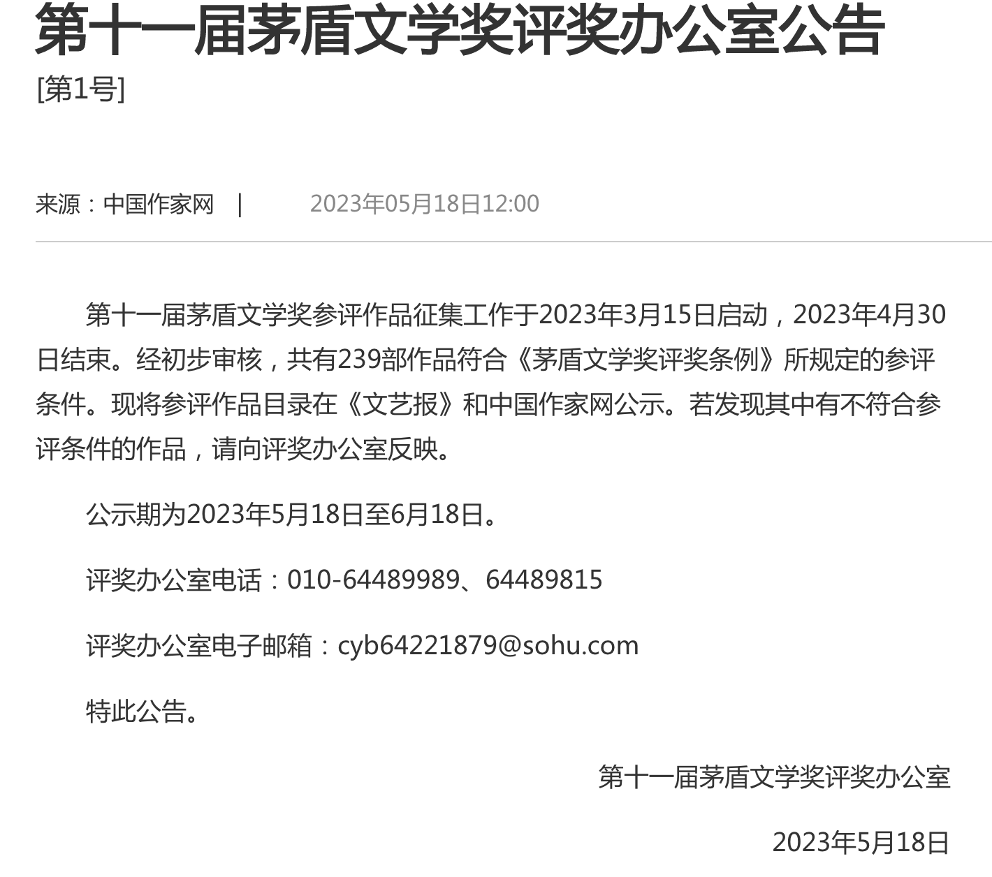 公告显示:第十一届茅盾文学奖参评作品征集工作于2023年3月15日启动,2023年4月30日结束。经初步审核,共有239部作品符合《茅盾文学奖评奖条例》所规定的参评条件。