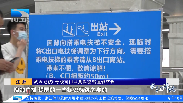 武汉地铁5号线司门口黄鹤楼站值班站长江源:“在我们的出口平台有一些堆积,我们第一时间就是派工作人员到现场来进行疏导,比如说增加标识、增加人员、增加广播、提醒的一些标识标语之类的,发现效果不是很好,大家就在一起讨论之后把这一部电梯改成下行。”
