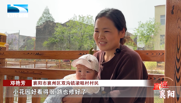 襄阳市襄州区双沟镇梁咀村村民 邓艳芳:“小花园好看得很 路也修好了,还有这亭子能歇下凉,不用跑出去就能逛公园了。”
