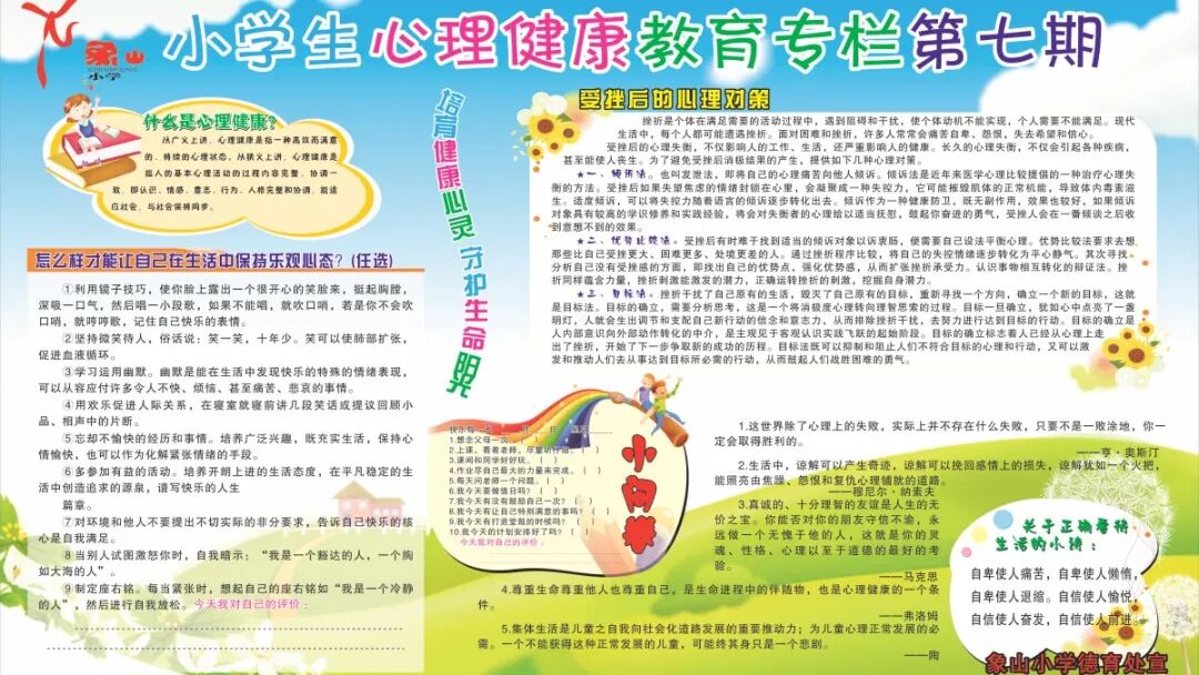 学校设置心理健康教育知识宣传专栏,为学生身心健康、和谐发展创造了良好的环境,从情绪调节、亲子沟通、校园欺凌、建立良好人际关系等方面,对学生进行心理引导。