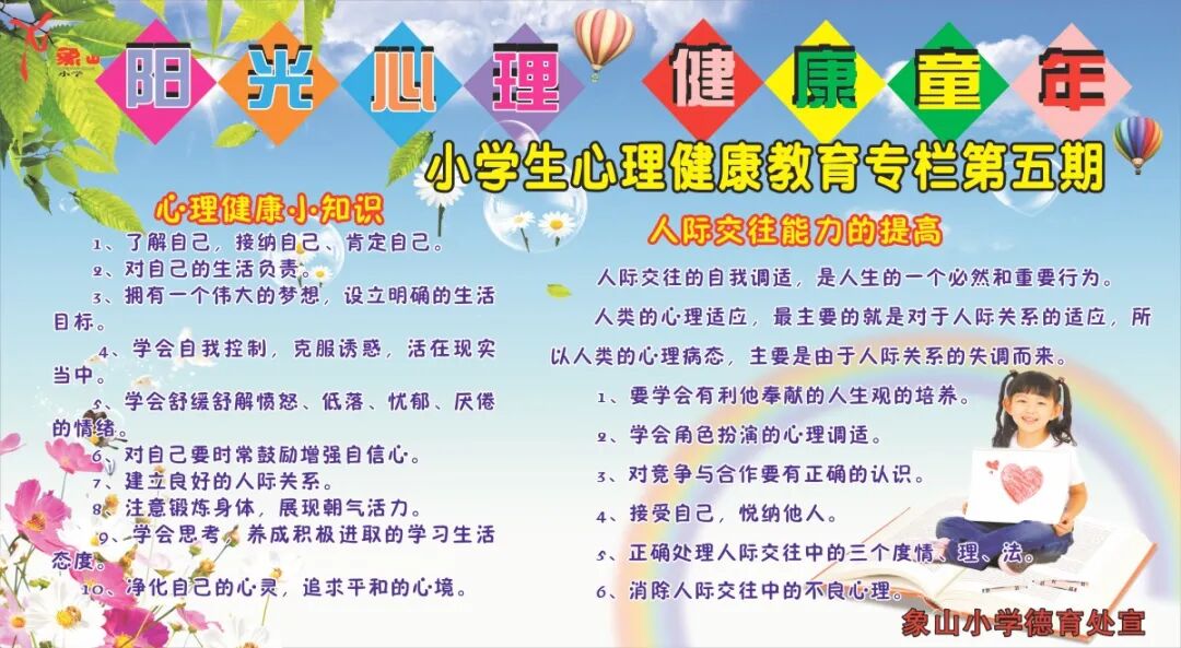 心有繁花,一路芳华!象山小学一直将心理健康教育作为一项长期的教育工作来抓,通过各种方式、方法帮助学生积极应对成长过程中的挫折和挑战,培养学生健康向上的心理素质,促进学生健康成长。
