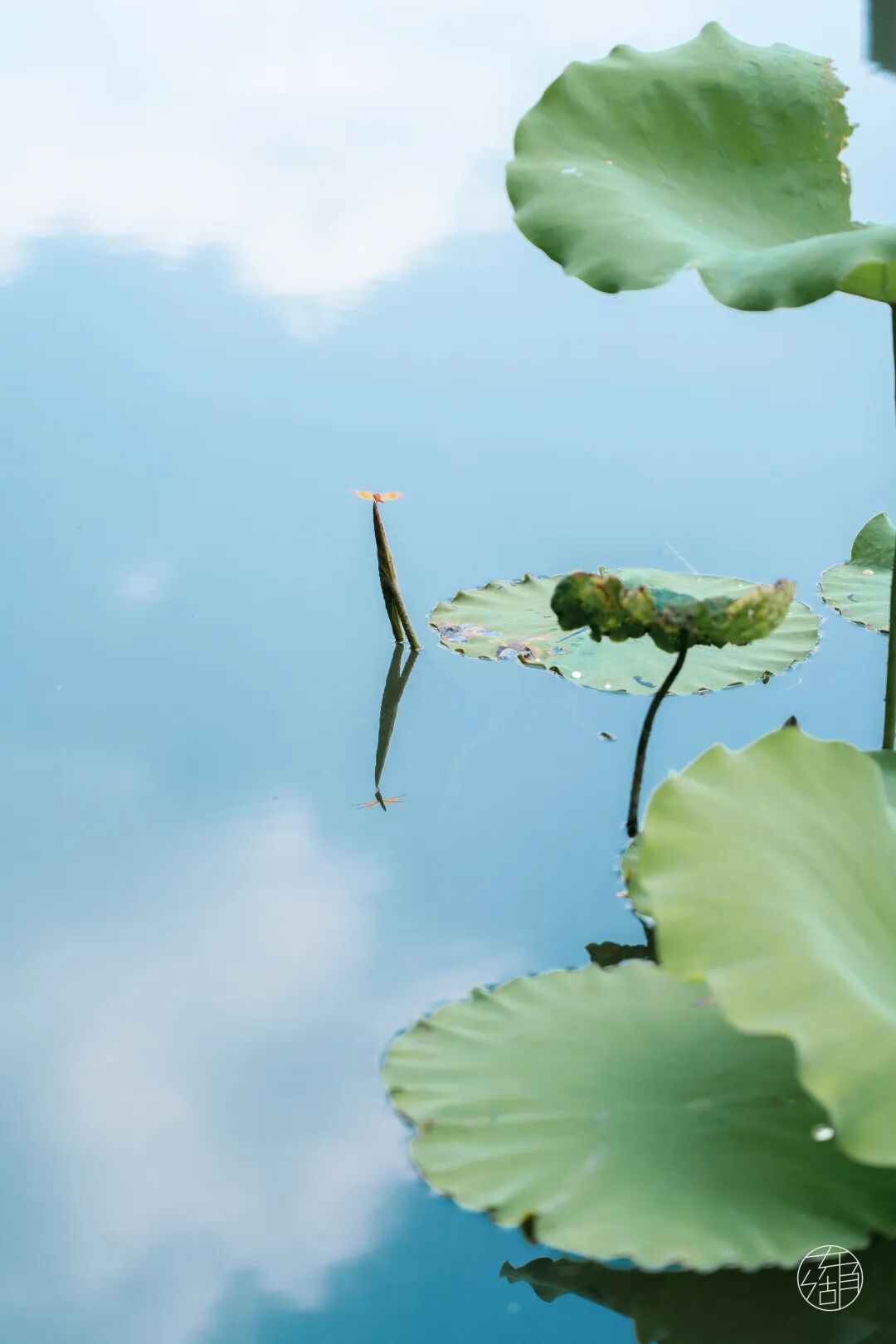 大部分荷花已然开放,还有小部分的花苞仍然含羞待放,飞舞的蜻蜓占得先机,立在花苞之上,静静等待花开。