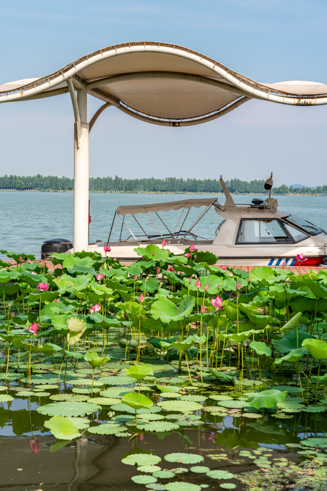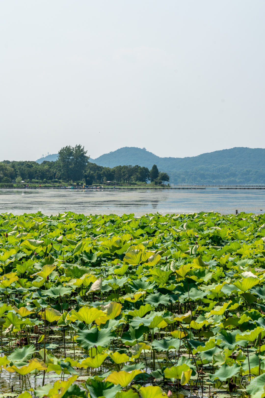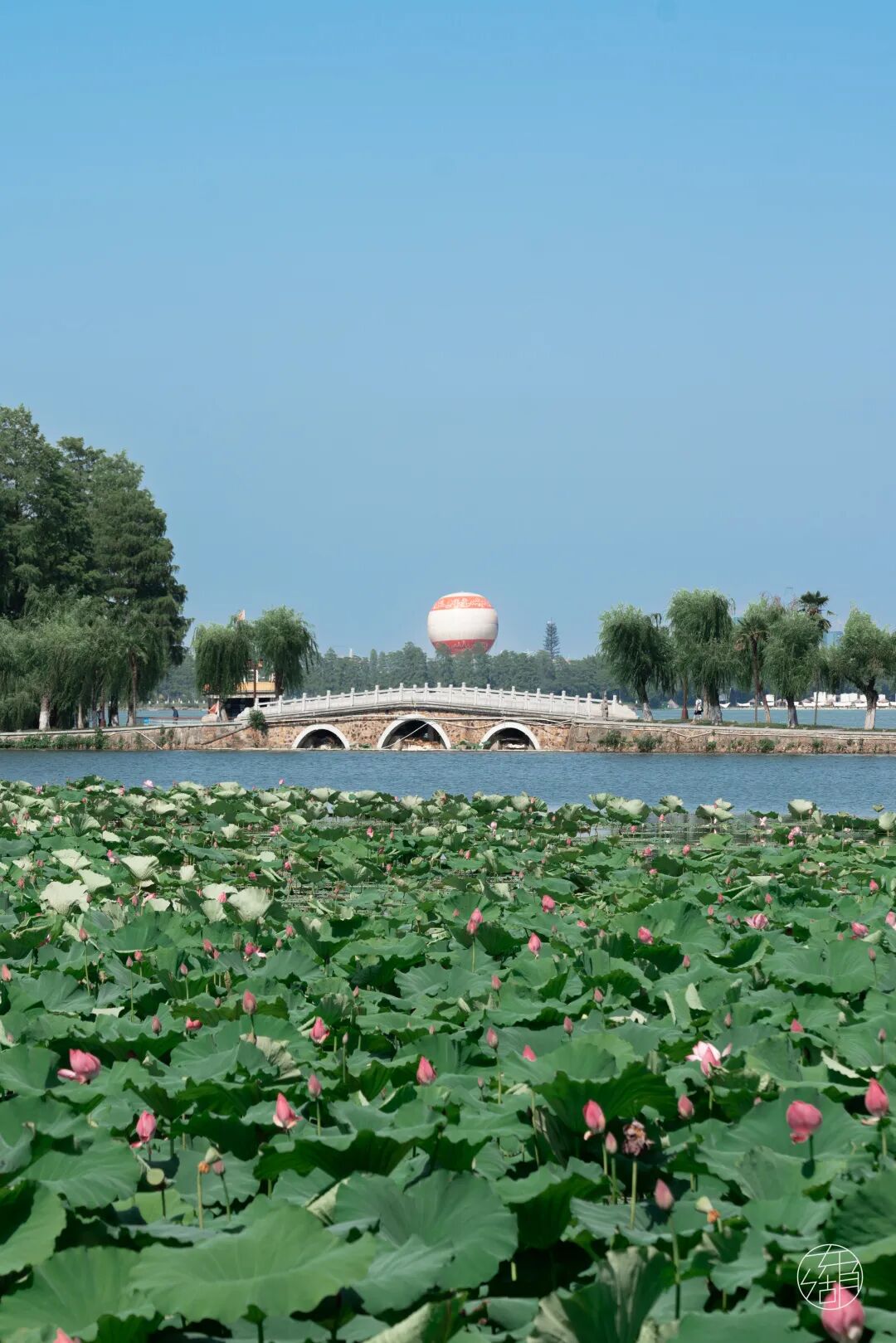 荷塘没有尽头,每一步都有荷花相随。身前是东湖,身后是磨山,山水之中赏花,着实是一种雅致的享受。
