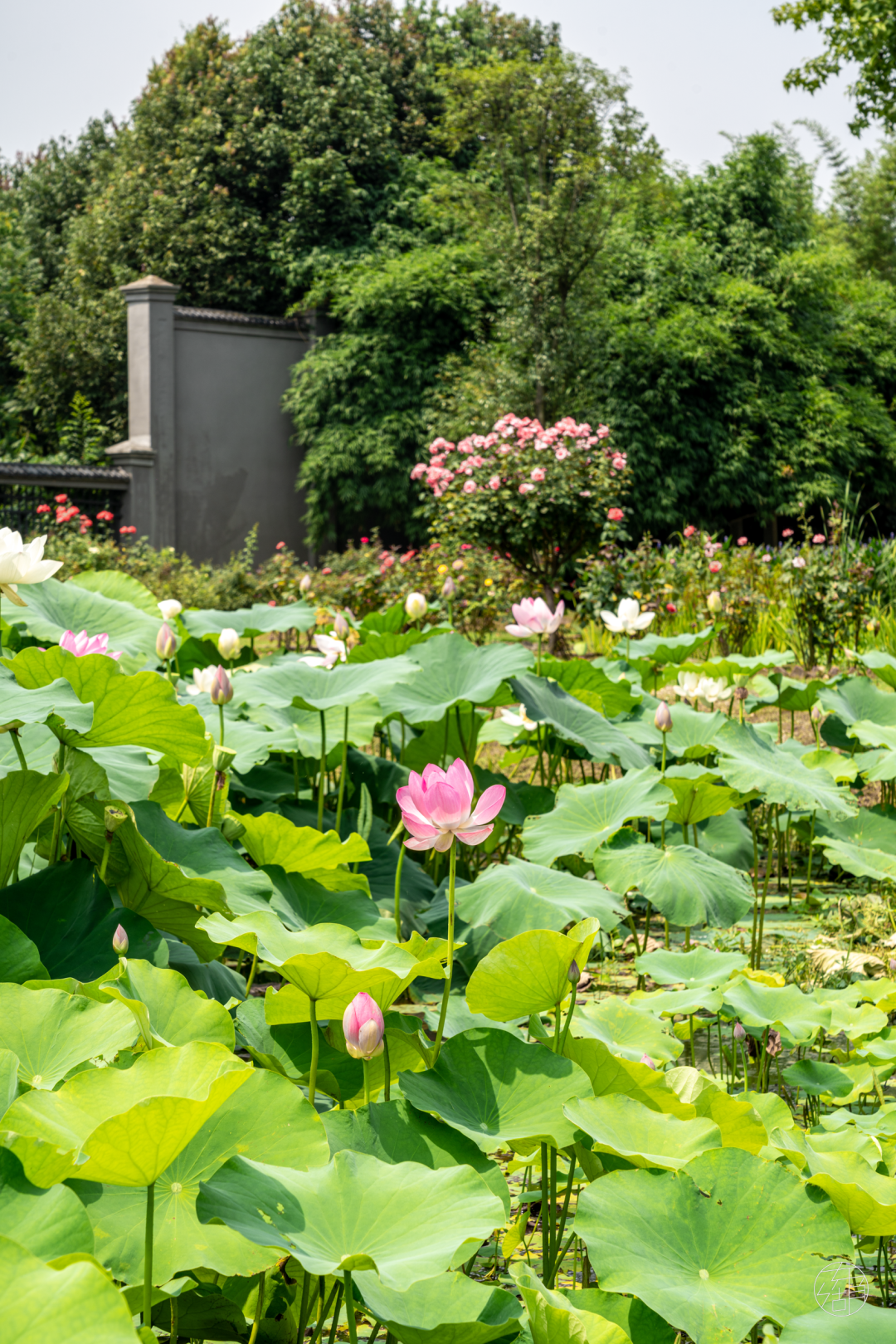 一旁的月季园里月季也正值花期。看月季开得热烈,荷花开得优雅,两种不同美感碰撞,也是一番难得的体验。