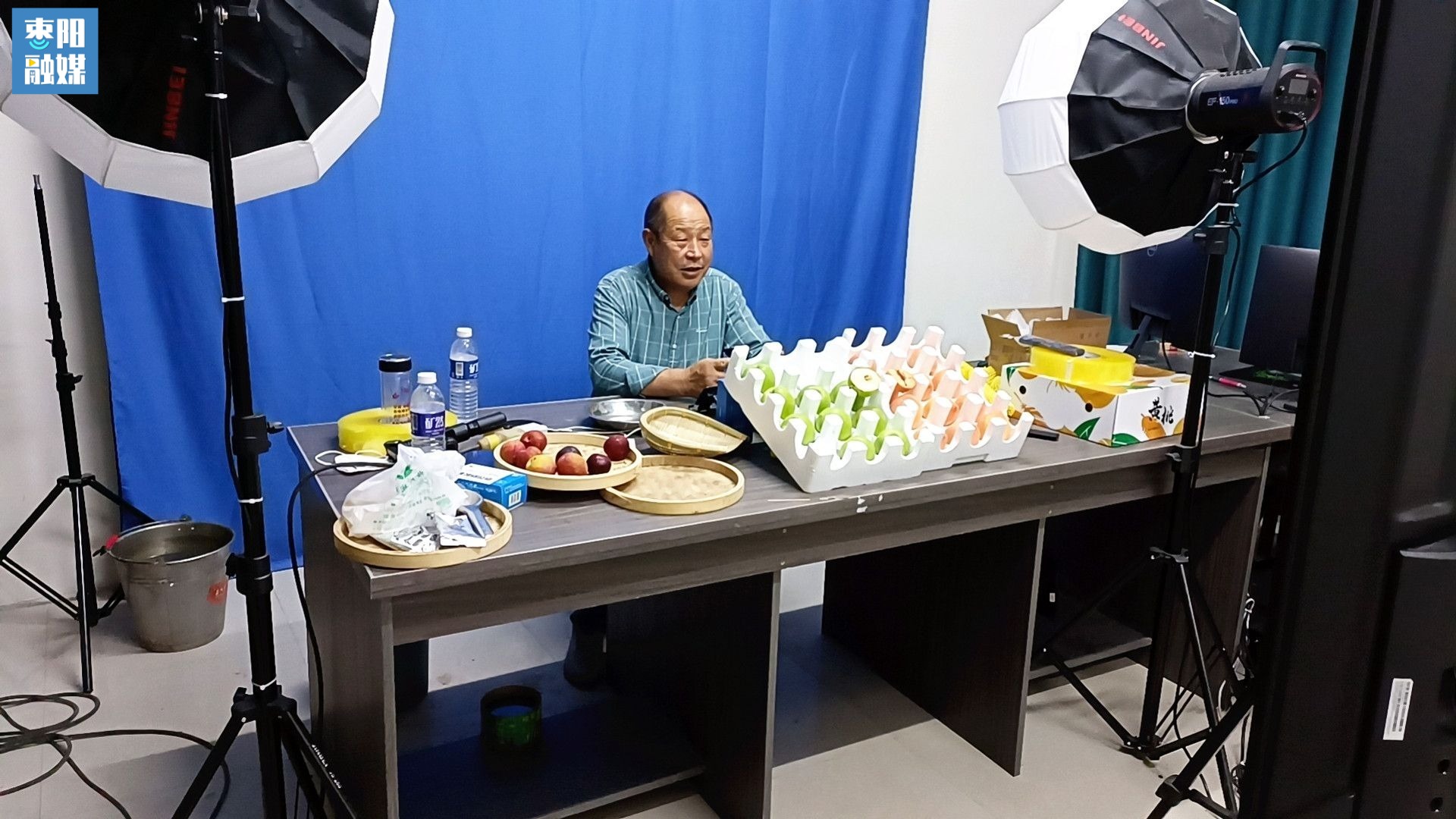 在枣阳市新市镇东李湾村直播间内,58岁的隗志会正在通过互联网直播平台售卖村里自产的花生、蜂蜜、水蜜桃和黄桃。