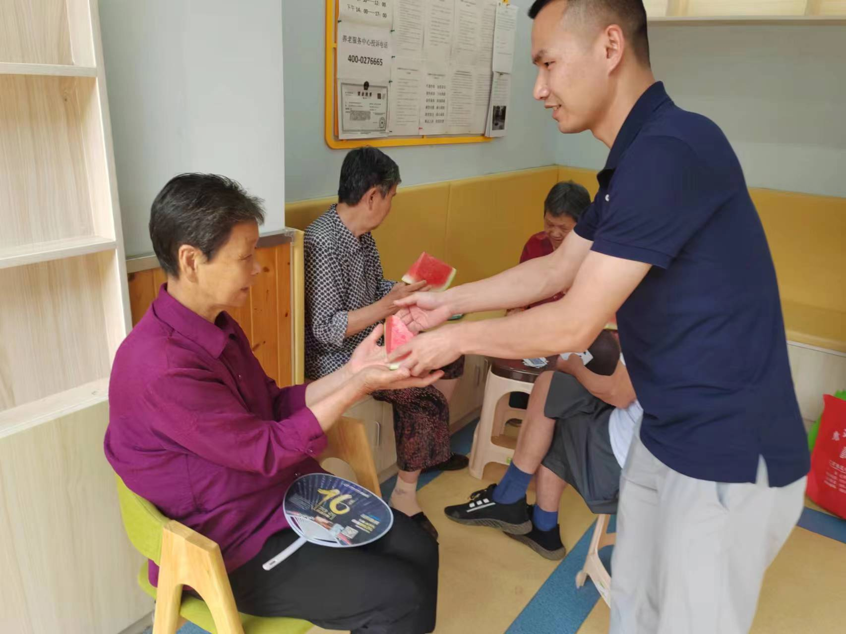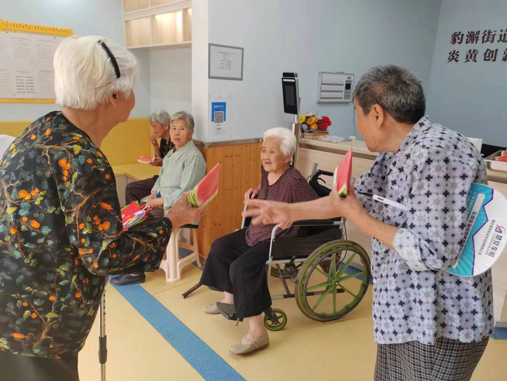 7月6日下午,武汉市东湖高新区豹澥街道九龙湖社区联合炎黄创新居家养老服务中心开展“西瓜送清凉,甘甜暖人心”活动,为辖区老年人送上盛夏里的一丝清凉。