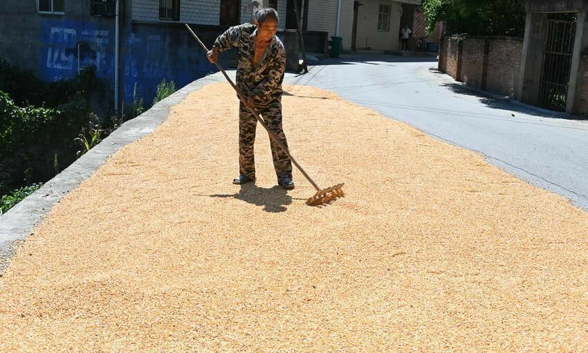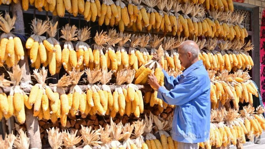 8月30日,在五峰乡曹家湾村、上塔村,农民正忙着晾晒玉米。村民的房前、道场里堆满了金灿灿的玉米,呈现出一幅幅美丽的秋收图景。