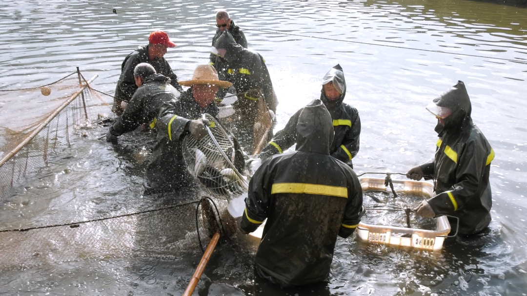 秋风起,鱼儿肥。南化塘镇玉皇山下的300亩泉水渔场也迎来丰收,渔民们将肥硕的鲈鱼分拣到盆里,再吊装进专用运输车,现场呈现出一派鱼跃水面、水美鱼肥的丰收景象。