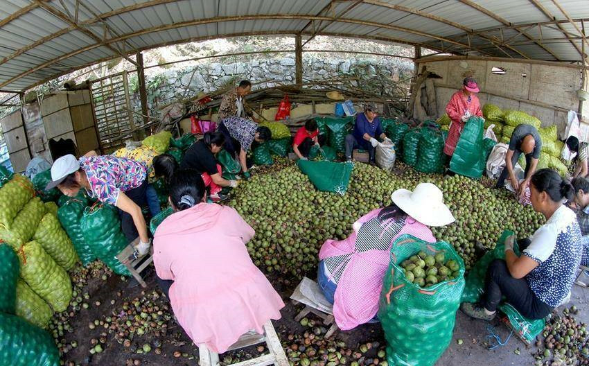 9月3日,在谭家湾镇青山村,村民忙着用竹竿打核桃,并将打下的核桃分拣打包。由于今年雨水充沛,加上管护到位,青山村260亩核桃基地迎来大丰收。