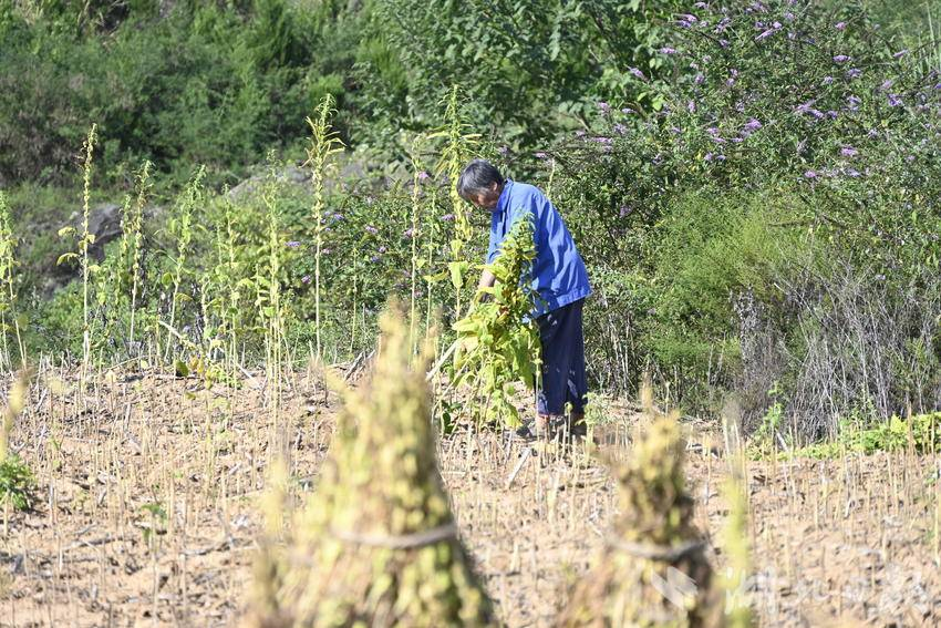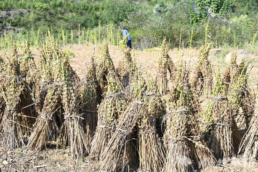 9月3日,在青山镇琵琶滩村,农户们正忙着收芝麻,收割、打捆、搭架晾晒。芝麻开花节节高,田间地头农户笑。