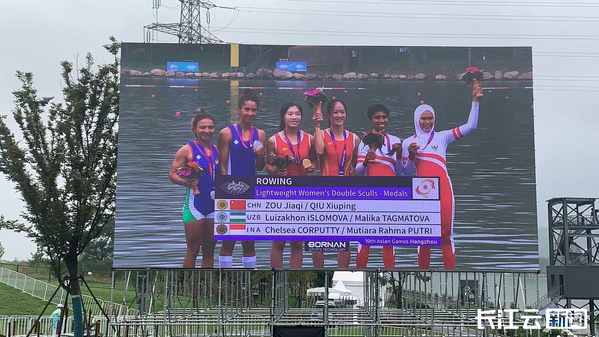 赛艇女子轻量级双人双桨的比赛中,中国选手邹佳琪、邱秀萍夺得本届亚运会的首枚金牌,图为获奖选手合影。长江云新闻记者肖昌盛 摄
