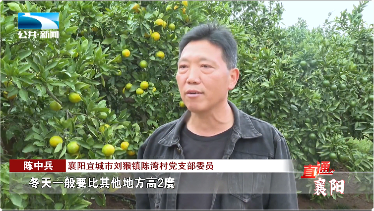 襄阳宜城市刘猴镇陈湾村党支部委员 陈中兵:“我们陈湾村地处小南河水库和石圣山周边具有冬暖夏凉独特的小气候,冬天一般要比其他地方高2度,夏天要比其他地方低2度,加上本地的土质是弱酸性砂土,非常适宜柑橘生长,种出来的柑橘特别好吃。”