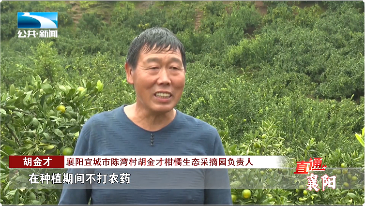 襄阳宜城市陈湾村胡金才柑橘生态采摘园负责人 胡金才:“在种植期间不打农药,树上面吊的灭蚊球灭害虫,树下面喂的鸡鸭吃虫,施农家肥,种出来的果实个头又大,口感又好又甜。”