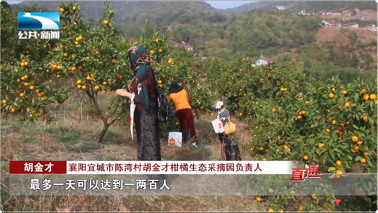 襄阳宜城市陈湾村胡金才柑橘生态采摘园负责人 胡金才:“我们柑橘成熟从9月6日开园采摘,在节假日期间人特别多,最多一天可以达到一两百人,采摘一直维持到12月底。”