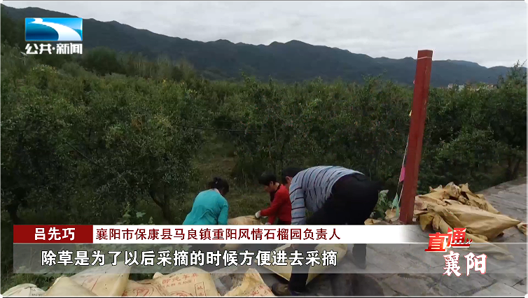 襄阳市保康县马良镇重阳风情石榴园负责人 吕先巧:“现在工人在除草,除草是为了以后采摘的时候方便进去采摘,第二个现在是在追肥,这个肥料我们是从山东拉回来的羊粪,追肥是为了给树补充营养,就是下一年的果子少发虫,品质好一些。”