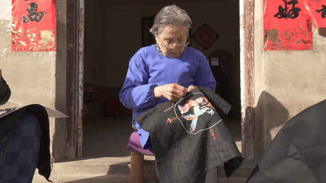 秋日暖阳下 挑花女正在挑织黄梅挑花