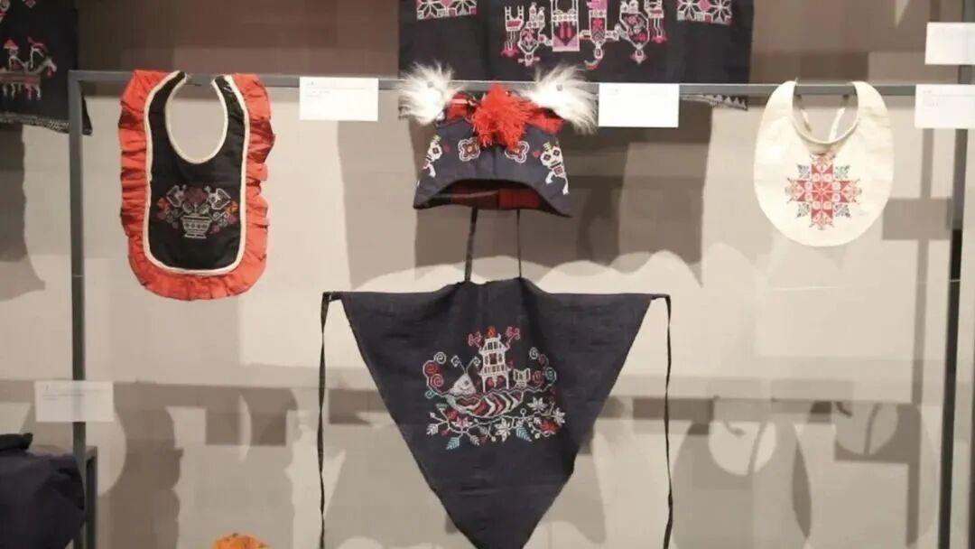 黄梅挑花女挑织的虎头背心虎头帽等