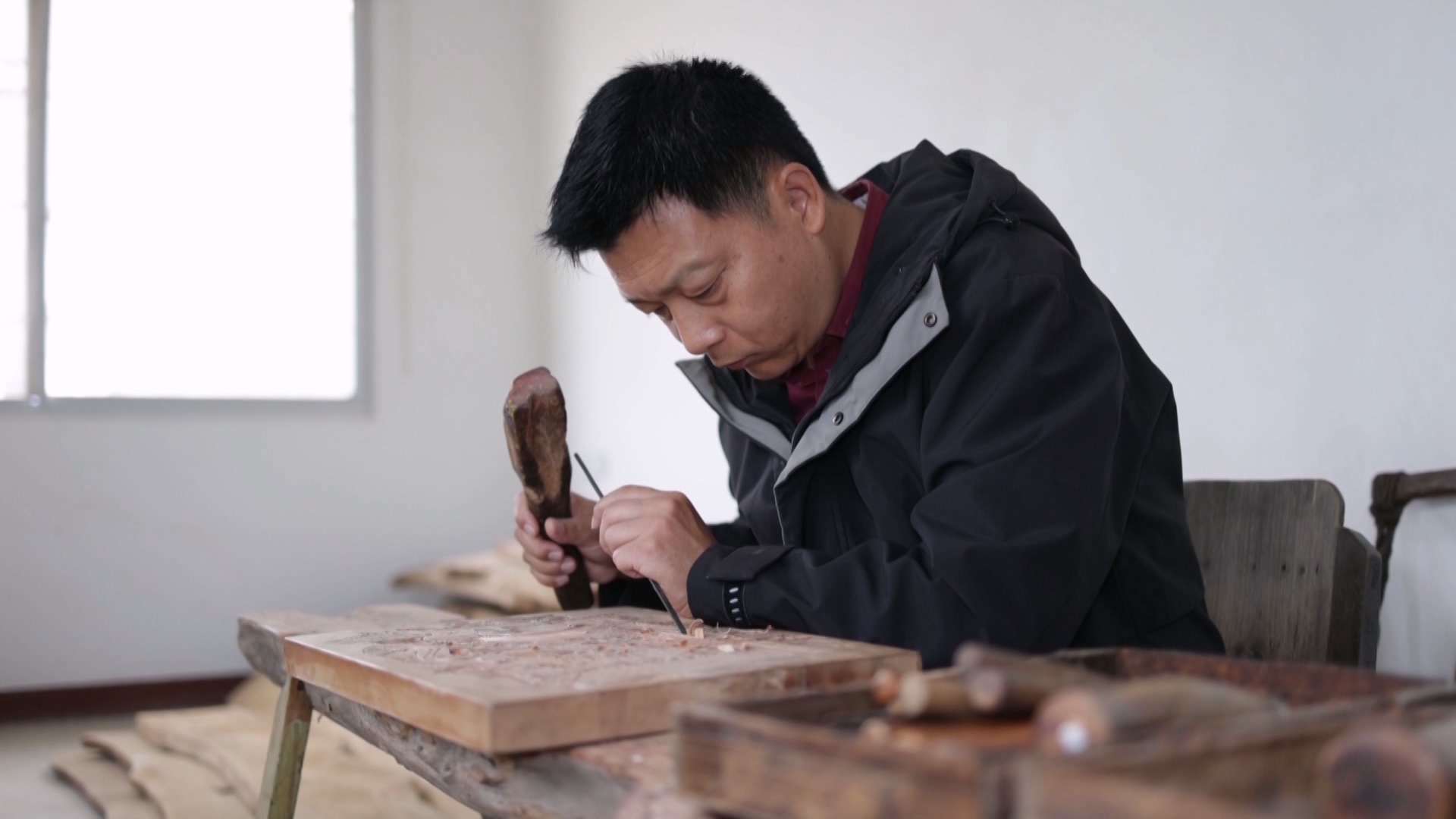 陈洪斌说:“我们老河口的特色叫‘丝胡须’,拿雕刀一刀一刀把这个胡须刻画成很细的一条线。这个应当有100多根,可以把它雕得比真人的头发丝还要细,像我也就练了将近10年时间。像我爷爷这个地方(手)的肌肉,他这样一使力,这块肌肉就有鸡蛋那么大。”