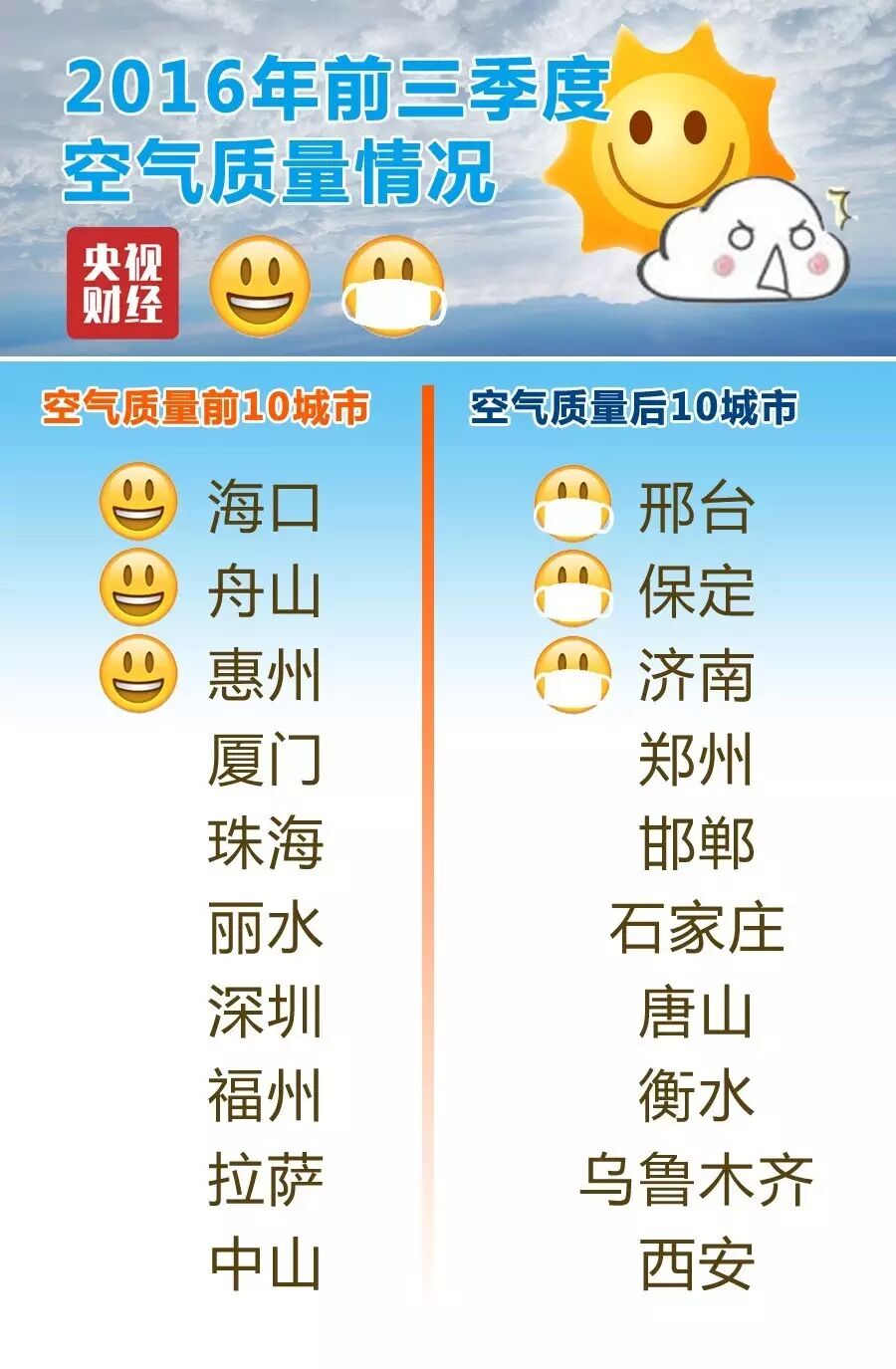 环境保护部昨天发布2016年前三季度74个城市空气质量状况。今年以来空气最好、最差10大城市都已经出炉了!你家上榜了吗?赶快来看一下!