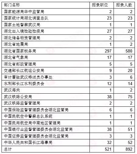 今年全国120多个中央机关及其直属机构和参照公务员法管理的单位计划共招录2.7万人,其中“鄂字号”岗位计划招录892人,招录人数同比均略有下降。据了解,去年国考在鄂招录1056人。