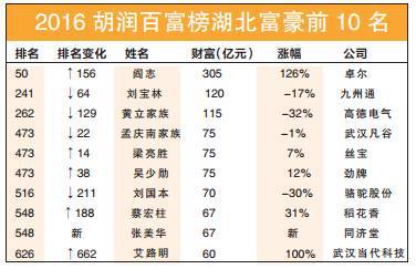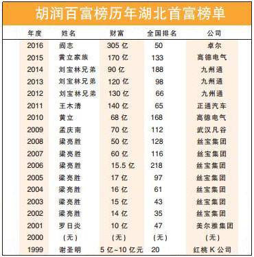 胡润百富榜上榜富豪上市公司财富计算的截止日期为8月15日,与去年一致。卓尔集团阎志、九州通刘宝林、高德电气黄立占据湖北富豪榜前三甲。刘宝林身家120亿,比去年缩水17%,排在全国第241位,下滑64位。黄立家族财富同样缩水32%,以115亿排在全国的262位。