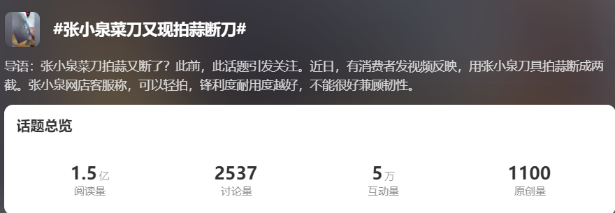据媒体报道,2022年7月,广州一女子用张小泉菜刀拍蒜后,菜刀断开。该女子询问张小泉菜刀售后客服,得到的答复是“菜刀不能拍蒜”。之后张小泉的董事长却说中国人的切菜方式不对,米其林都不这么拍蒜 ,引起舆论风暴。