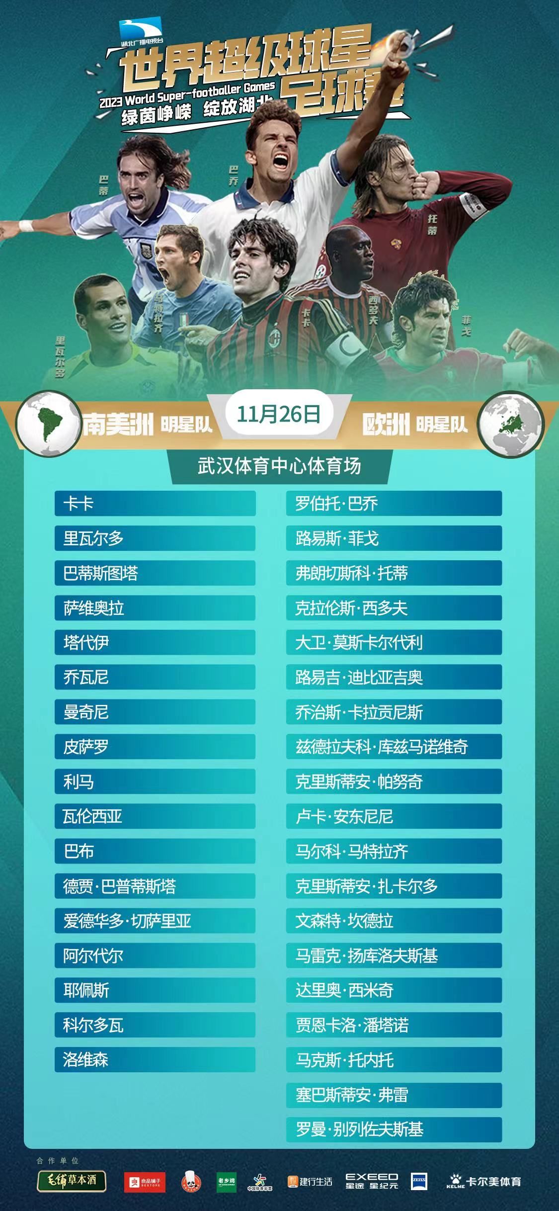 菲戈、巴乔、里瓦尔多、巴蒂斯图塔、西多夫……这36位足球传奇里面,总会有你最喜欢的青春偶像,带上回忆、带上惊喜、带上梦想,来湖北武汉,赴一场青春的约会,见陪伴我们整个青春的球星。