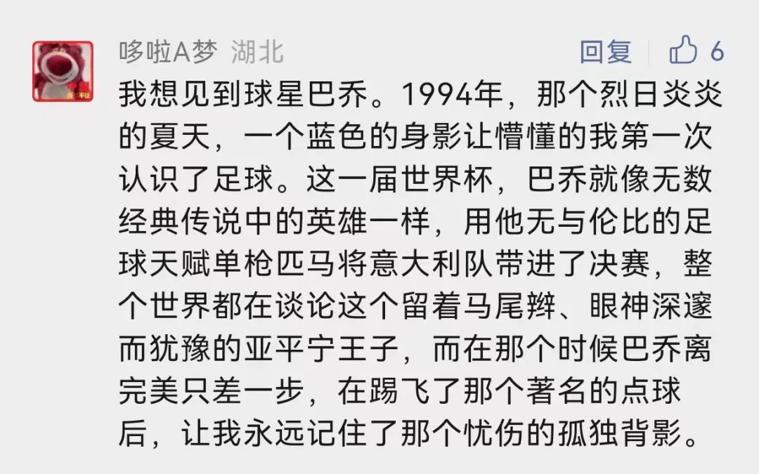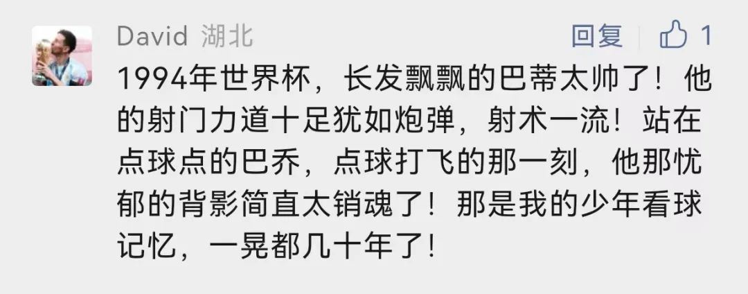 我们忘不了,1990年盛夏的意大利,巴乔的马尾辫和长途奔袭身影;忘不了他罚丢点球时忧郁的背影,那是1994年的美利坚之夏,巴乔以一己之力将意大利带入决赛,却倒在决赛的十二码前,令无数球迷心碎……