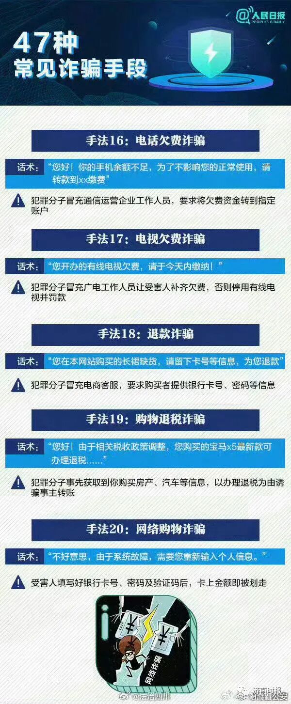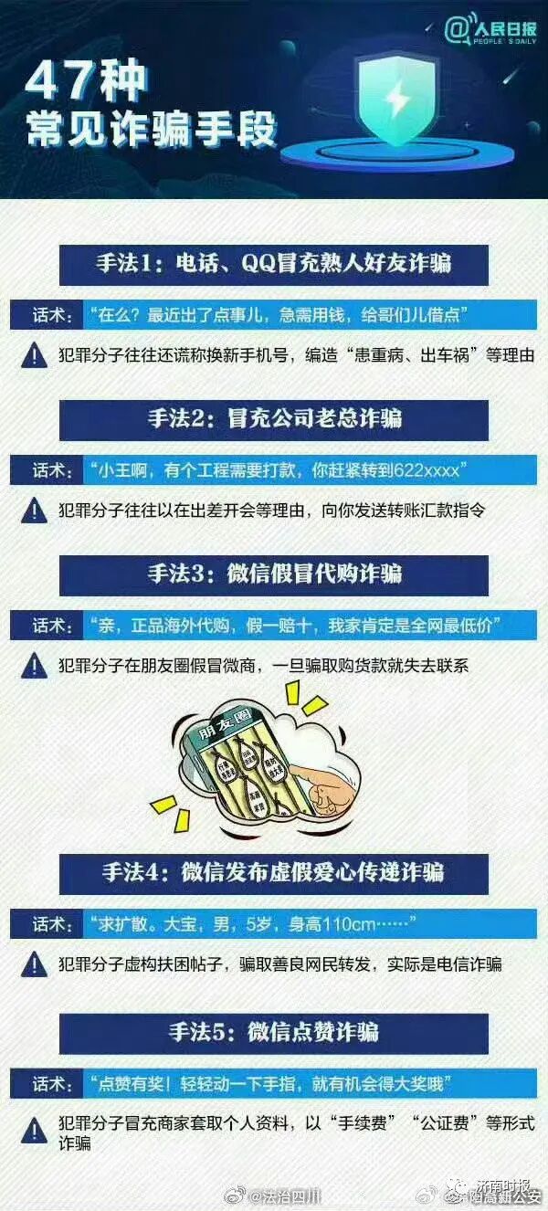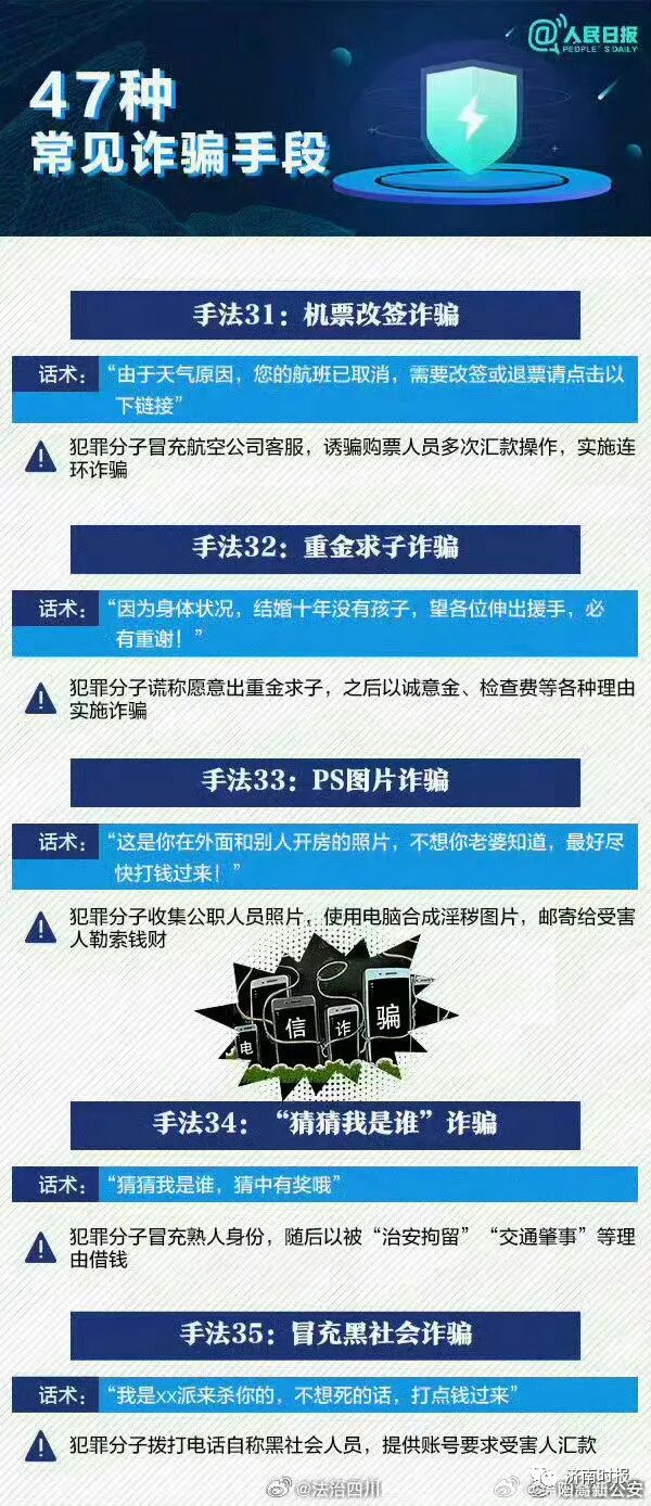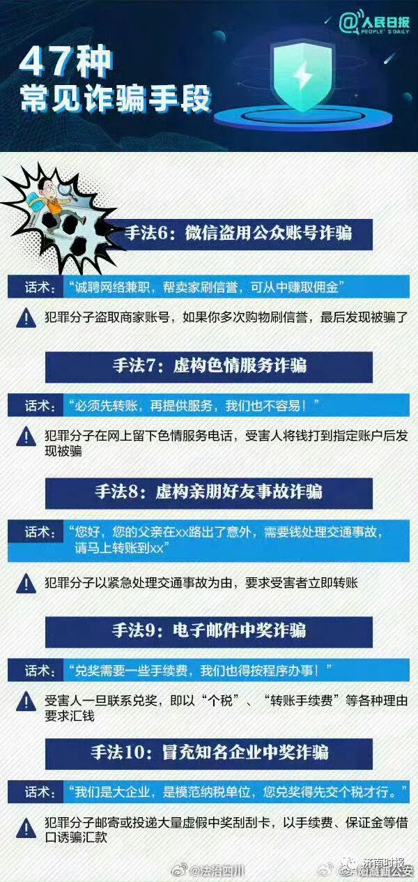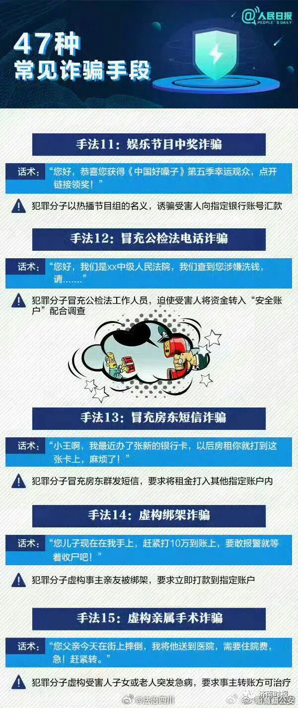 诈骗花样不断翻新冒充公司老总、冒充公检法虚构家人手术、重金求子提供考题、“股神”荐股……这些骗局你都见过吗?47种常见诈骗手法看图了解一下。