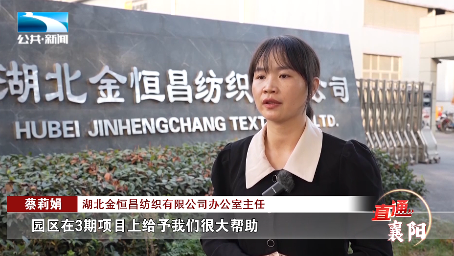 湖北金恒昌纺织有限公司办公室主任 蔡莉娟:“园区在3期项目上给予我们很大帮助。截至目前,我们已突破了两个亿的销售收入,我们对自己完成全年2.5亿的销售目标很有信心。”