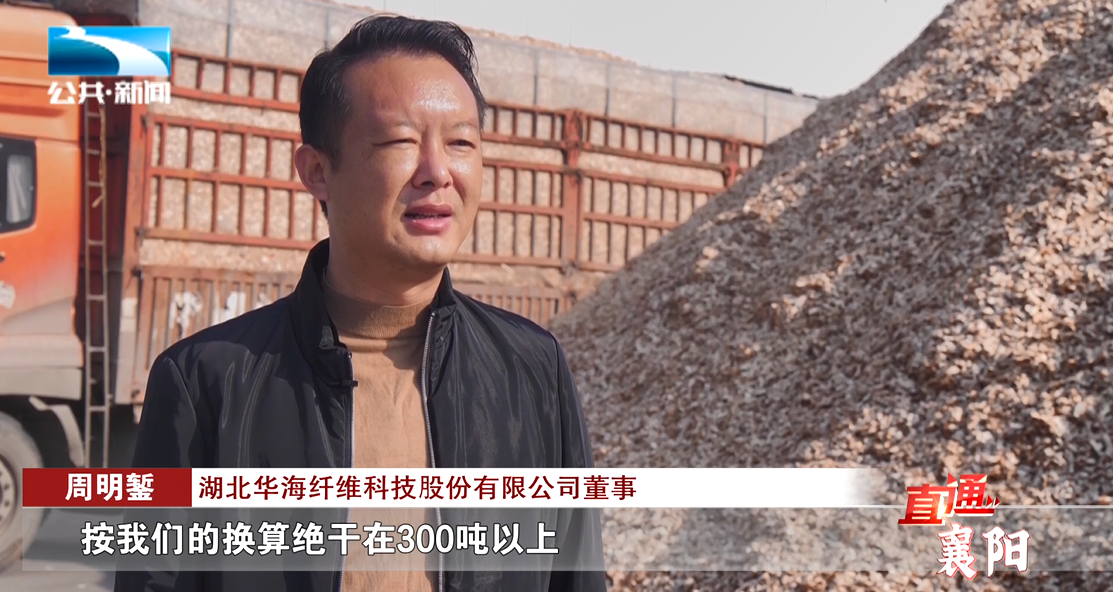 湖北华海纤维科技股份有限公司董事 周明錾:“杨木要求是净片、无树皮、无虫眼,目前我们每天收购量,按我们的换算绝干在300吨以上,每天像这种半挂车有将近三四十辆。”