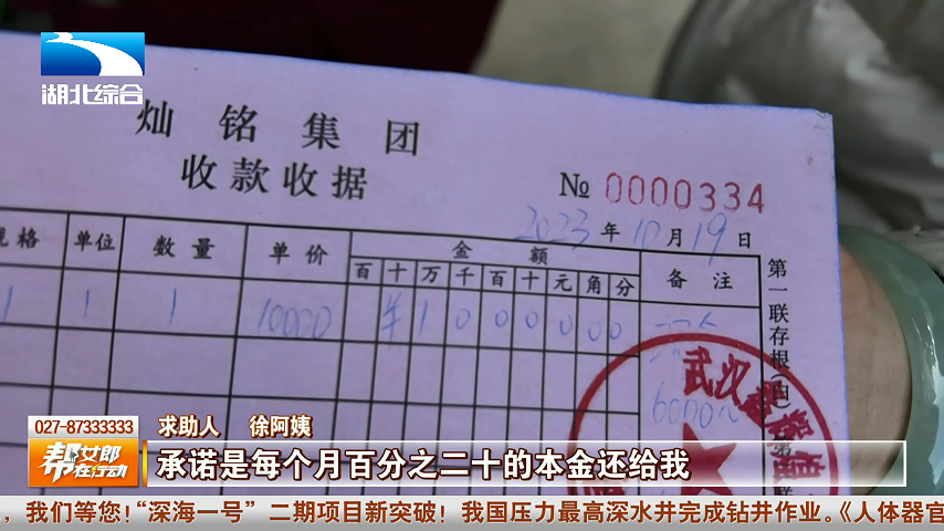 今年夏天,徐阿姨和朋友们参加了一个武汉到蕲春的免费老年旅行团,期间,旅行社工作人员推荐了一个投资项目。“说投资5个月就能退还本金,每个月返还20%本金,第6个月,给10%利息,投资1万元就是1000元利息,每个月还可以免费出去旅游一次。”