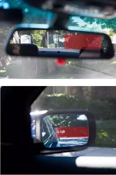 看上面两图的标红区域,你会发现,外后视镜中的红色区域(景物)和内后视镜中的红区(景物)是完全相同的!换言之,你在外后视镜中看到的不是你的侧方,是后方!
