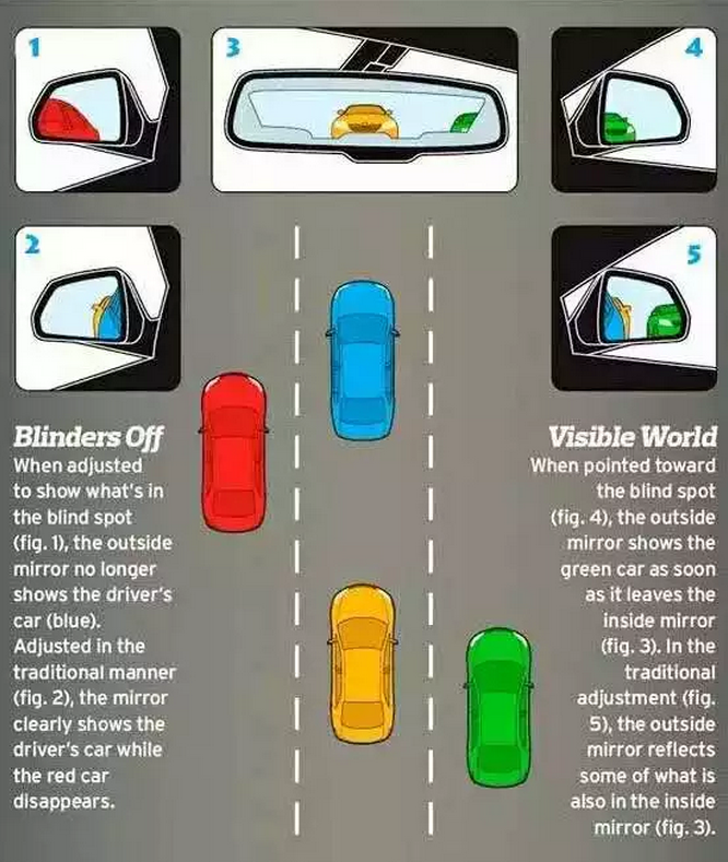 英国CAR AND DRIVER杂志2010年的一篇文章说,著名的美国汽车工程师协会(SAE)早在1995年就发表过一篇论文,倡议广大车主将车外后视镜的角度调节得尽量外展,就可以尽可能避免视线盲区。文章主张车外后视镜外展到尽量与车内后视镜不出现重叠区域。