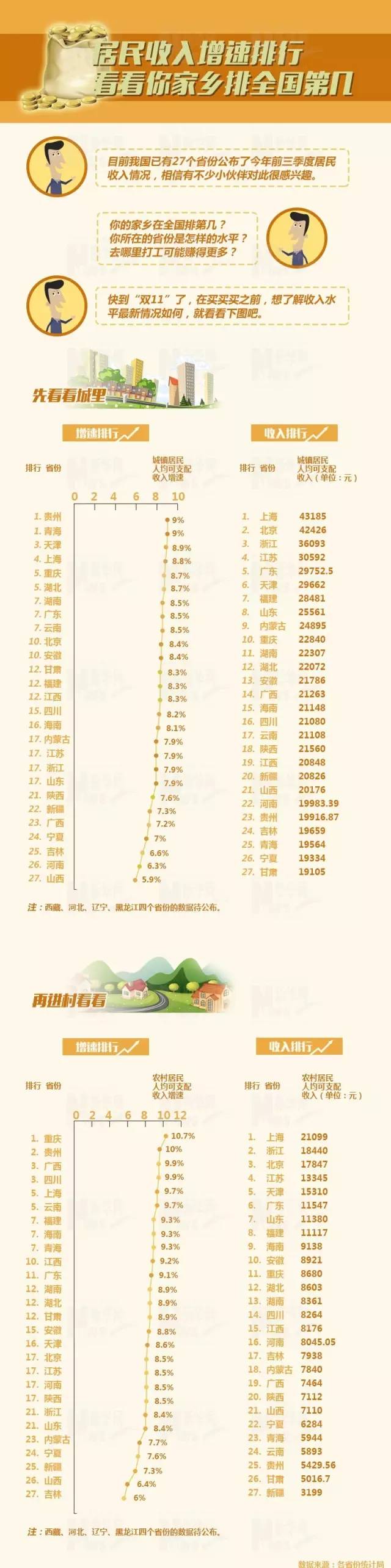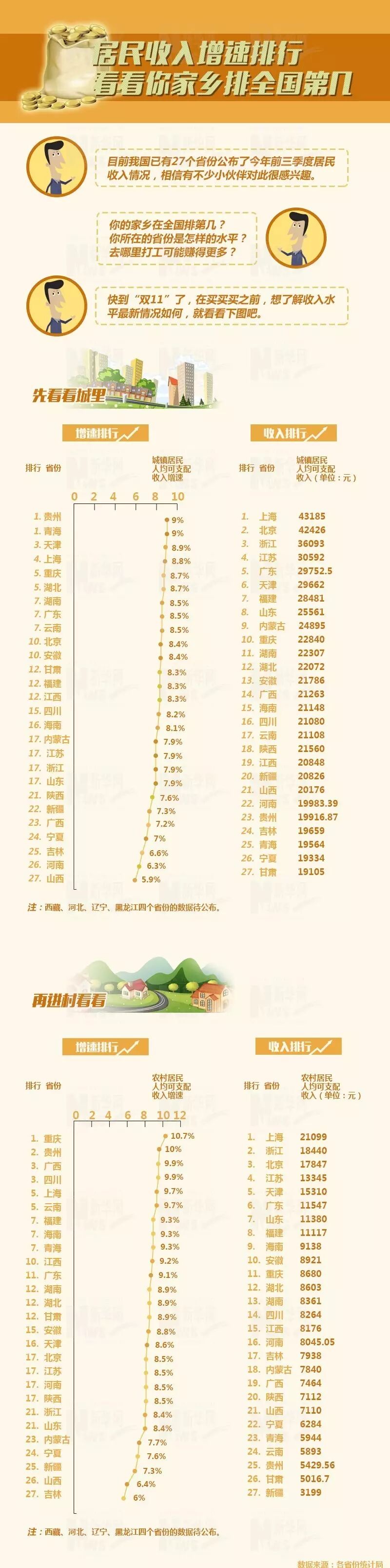 不知不觉2016年要接近尾声了,湖北省在前三个季度中,城镇居民人均可支配收入增速为8.7%,人均可支配收入为22072元;农村居民人均可支配收入增速为8.9%,人均可支配收入为8603。有没有迫不及待的想拿起“小算盘”算算今年自己的收支情况呢?看看你的收支更加接近于那个省份呢?