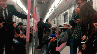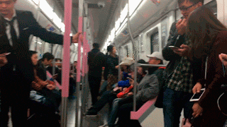 中午12点的地铁2号线,不算很挤。 大部分人在重复相同的动作,低头看手机。