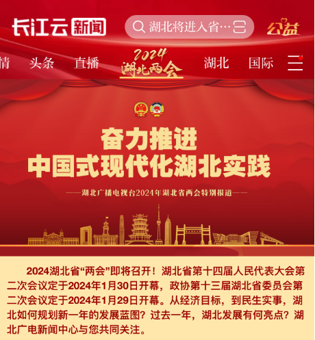 1月28日,湖北省两会开幕在即,湖北广电旗下长江云新闻客户端推出“2024湖北两会”专题、“看湖北”专区,“湖北”频道全新改版上线,打通央、省、市、县四级传播渠道,为用户提供权威、全面、多维度、多层面的两会消息、湖北资讯。