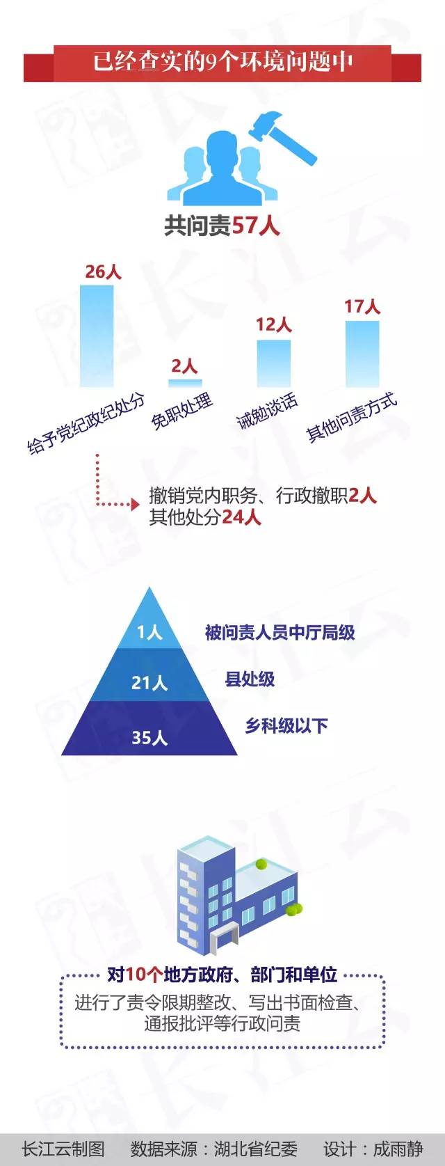 因主体责任落实不力,随县政府副县长王成民受到行政记过处分;因履行部门监管职责不力,导致近年来超界开采等违法问题屡有发生,随县国土资源局现任局长汪祖国、原局长祝军被诫勉谈话,副局长蒋小虎受到行政记过处分,吴山镇国土资源所所长张刚受到记过处分,万和镇国土资源所所长冯洪明受到警告处分;随县环保部门在督促园区及企业办理环评手续和落实环保验收工作上不及时、不到位,随县环保局局长龚华新被工作约谈;万和镇政府、吴山镇政府在督促企业开展扬尘治理方面不到位,万和镇在组织督促企业实施拦污坝建设方面不及时,万和镇政府和吴山镇政府分别作出书面检查,万和镇镇长申锐、吴山镇镇长王新分别被通报批评。