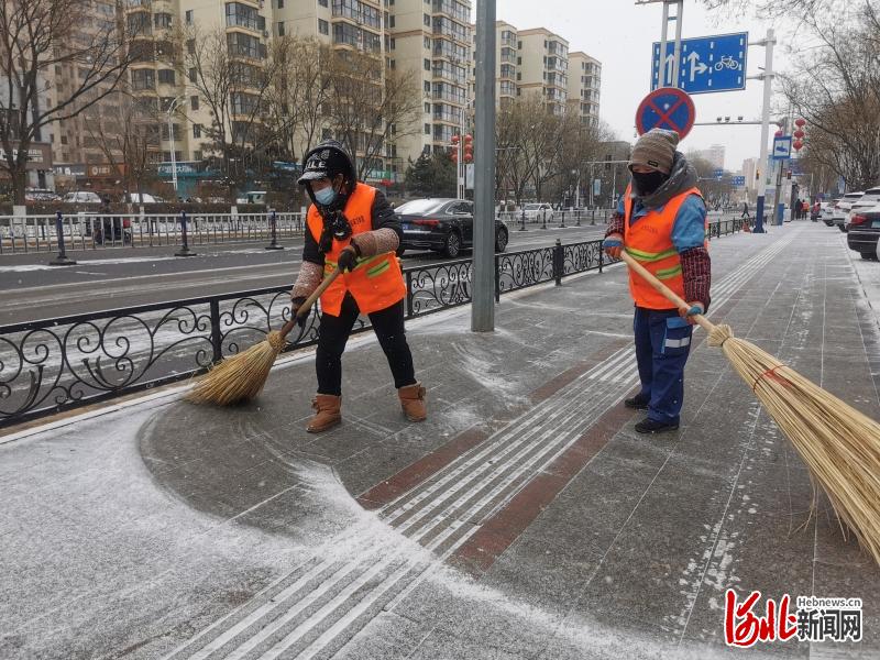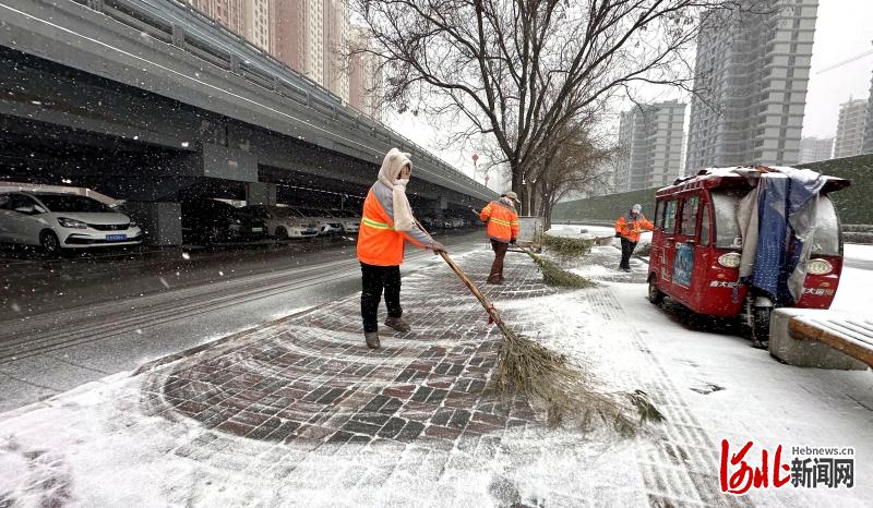 2月20日上午,石家庄市桥西区环卫工人清扫路面积雪,保证道路畅通和市民出行安全。(河北日报记者张昊摄)