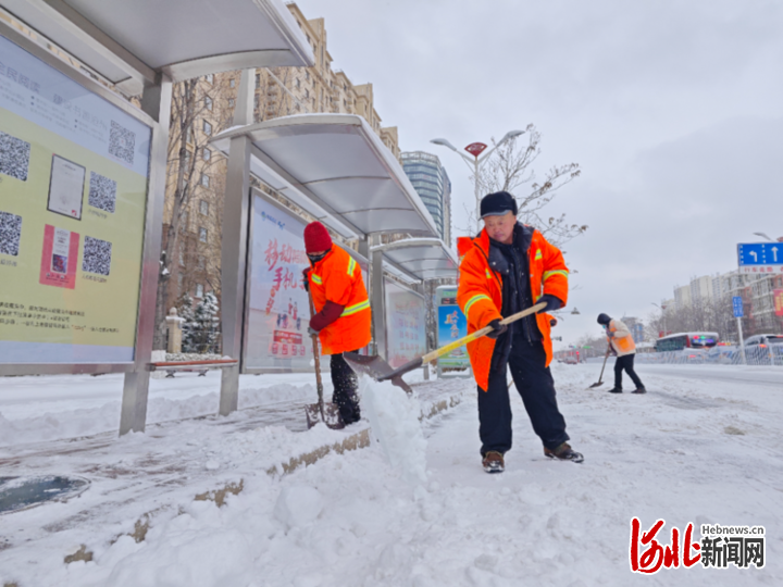 昨天早晨开始,沧州出现降雪天气。雪天路滑,更多市民选择公交出行。今天一早,沧州市组织环卫工人清理公交站台积雪,保障大家出行安全。(河北日报记者 袁铮摄)