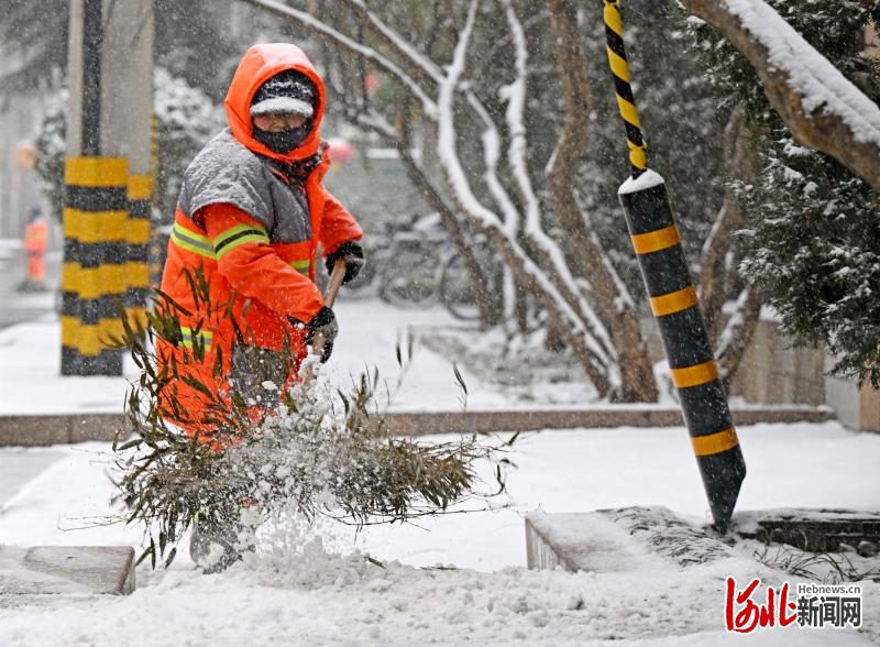 2月20日,石家庄迎来降雪,环卫工人进行清扫积雪作业。