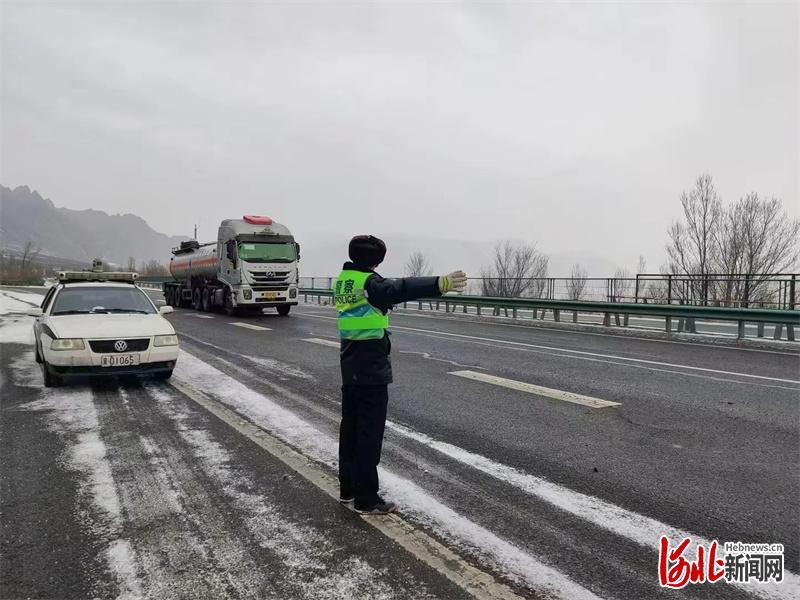 【20日20时50分】应对大范围降雪 河北高速交警组成压车编队带道保畅