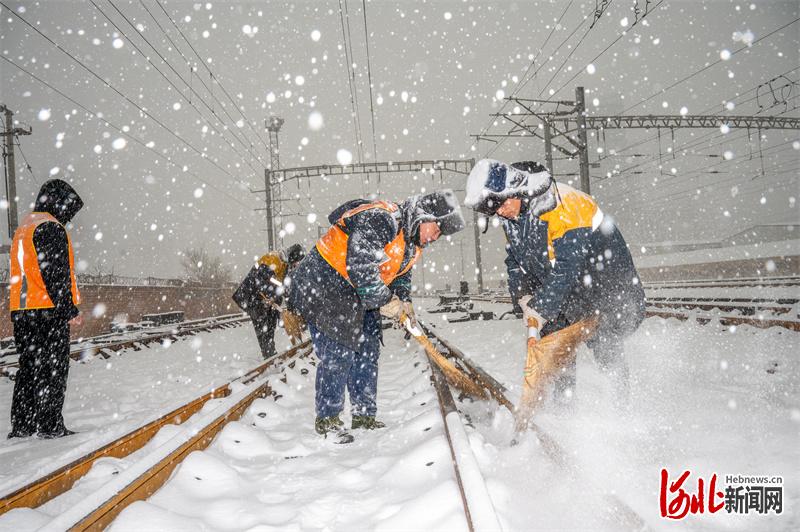 石家庄工务段北站工区职工进行道岔除雪作业。河北日报记者赵杰摄