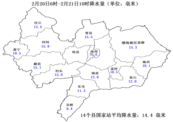 河北新闻网讯(通讯员买文明 河北日报记者宋平)根据河北省142个气象站数据统计,2月19日20时至21日7时,除承德中北部外,河北省其他地区出现雨雪天气,共136个气象站迎来降水,降水区平均降水量为10毫米,保定南部、石家庄中部、沧州中部、邯郸西部有12个站超过20毫米,沧州运河区降水量最大,为25.6毫米,石家庄主城区为20.7毫米。21日7时,保定、沧州及以南地区雪深普遍在7厘米以上,望都雪深达23厘米,石家庄主城区为19厘米。
