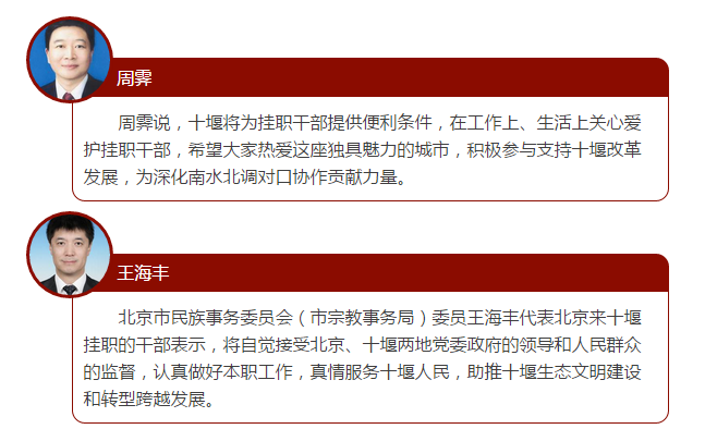 昨天(11月29日),北京市选派的第三批10名挂职干部履新十堰。这10名来自北京市的干部,1名干部拟挂任十堰市委常委、副市长,另9名干部拟挂任各对口县市区政府副职(对口县市区分别是:张湾区、茅箭区、丹江口市、郧县、郧西县、竹山县、竹溪县、房县,武当山特区),挂职时间为1年。