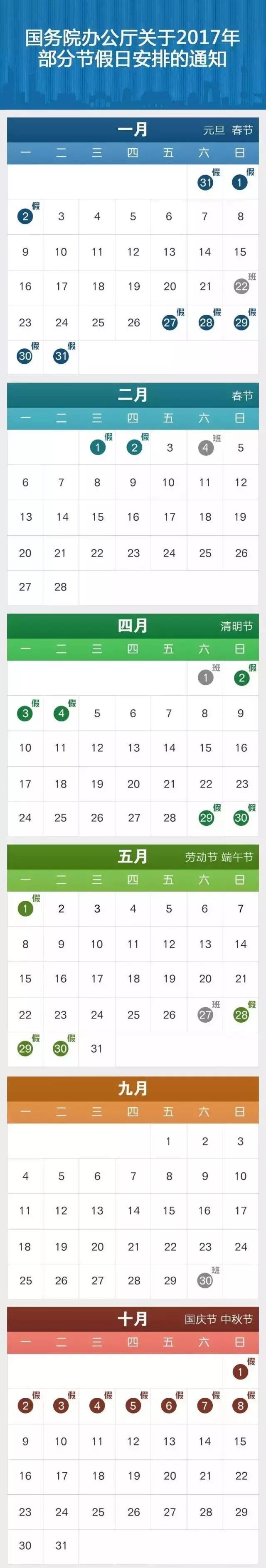 经国务院批准,现将2017年元旦、春节、清明节、劳动节、端午节、中秋节和国庆节放假调休日期的具体安排通知如下。