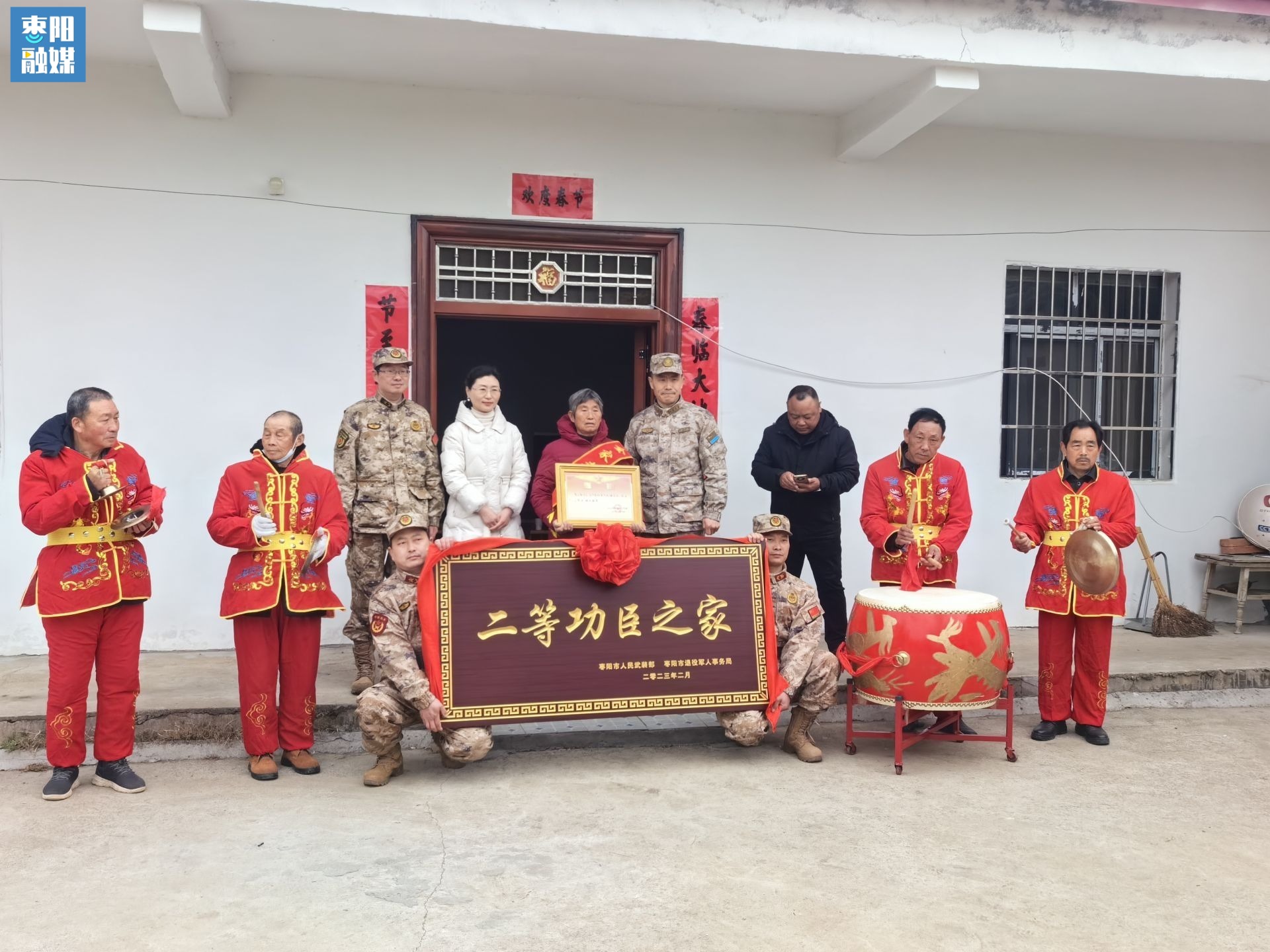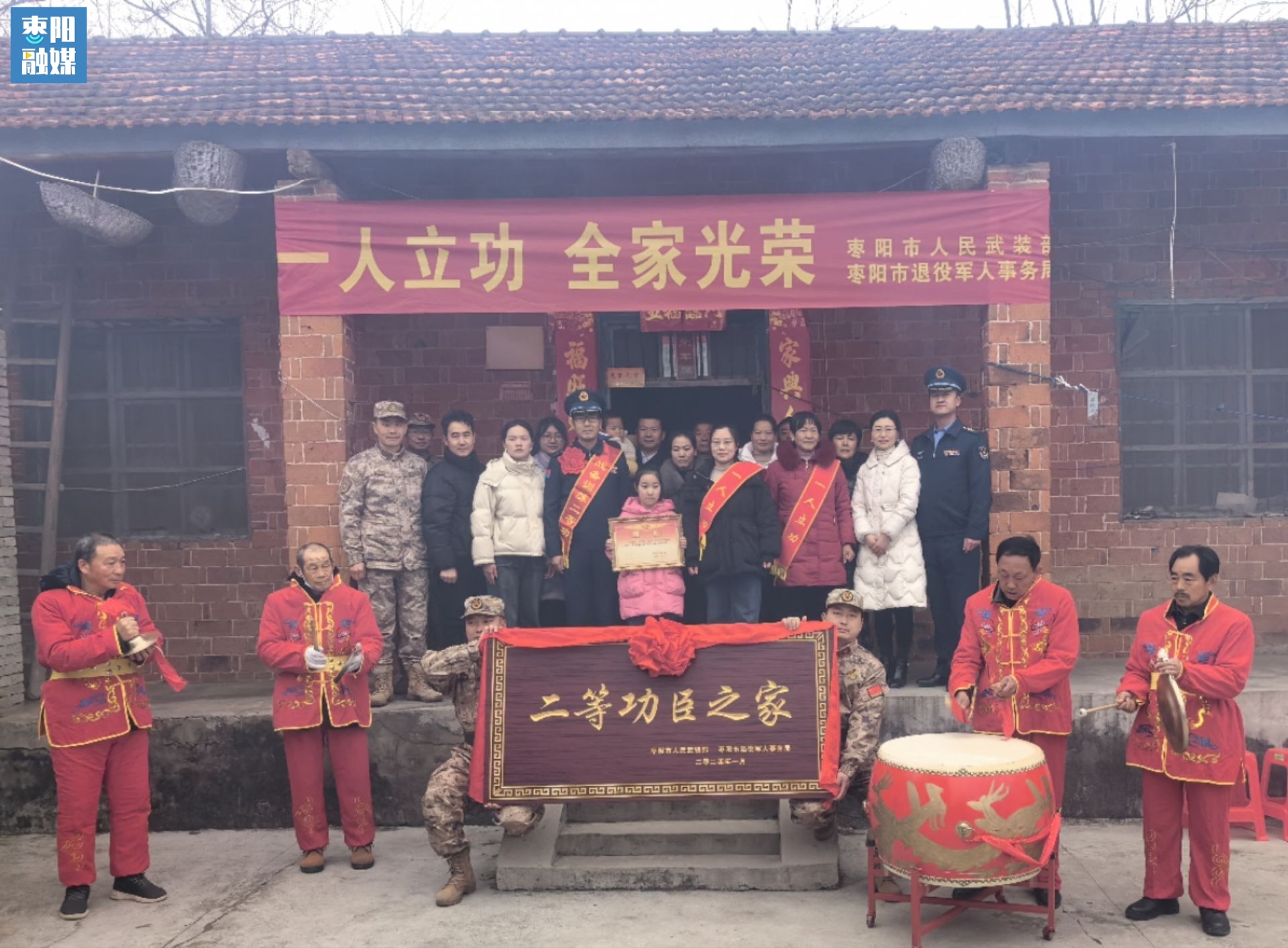 3月5日上午,湖北省枣阳市人武部、枣阳市退役军人事务局与吴店镇政府为唐家老湾村马金虎、五口村熊正锋家人送上二等军功喜报。醒目的牌匾与条幅,沿途吸引不少群众驻足观看,并投来赞许的目光和声声祝贺。