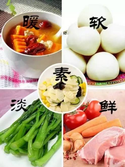 暖、软、素、淡、鲜这五类食物冬季要多吃,不一定非得是图中这些,只要是这五类中的就可以。