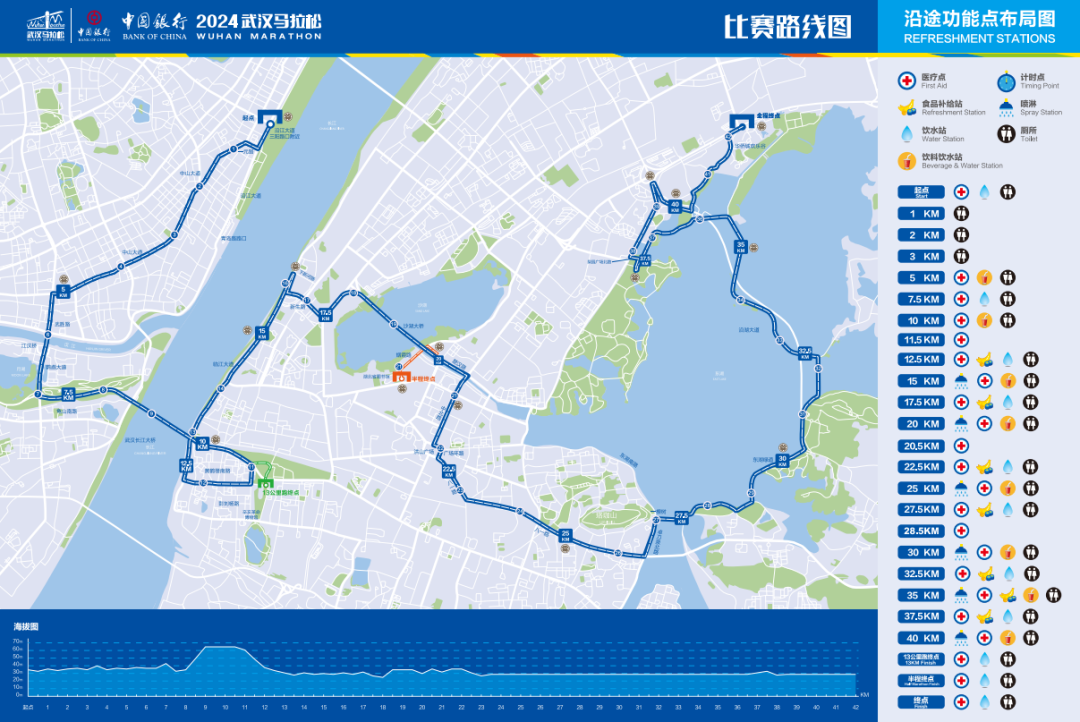 全程马拉松比赛线路:沿江大道三阳路口(起点)—沿江大道—一元路—中山大道—武胜路—江汉桥—鹦鹉大道—龟山南路—长江大桥—黄鹤楼南路—彭刘杨路—彭刘杨西路—临江大道(下新河路口折返)—新生路—友谊大道—沙湖大桥—楚汉路—中北路(含辅道)—洪山广场环路(东半环)—八一路(南侧洪山广场环路至光谷大桥西落点<含下穿通道>、北侧光谷大桥西落点至卓刀泉北路)—卓刀泉北路—东湖绿道(湖山道、湖中道、听涛道)—沿湖大道(牡丹园东门折返)—梨园广场北路—二环线辅道(梨园地下通道入口处上方进入西侧辅道逆行)—红庙立交一层(逆行)—东湖隧道辅道(逆行)—银杏原路—渔光路—紫薇路—欢乐大道辅道—武汉欢乐谷(全程终点)。