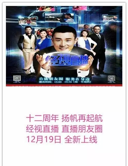 十二周年,经视直播服务升级,依然在您身边,最初的坚守,不会忘记,新的征程,扬帆再起航,今后,您有困难想找人帮忙,有问题想向政府反映,有新鲜事、奇葩事儿想和大家分享,有心愿想要完成,有意愿想找个工作,有东西想专卖,都请加入《经视直播》的“直播朋友圈”吧!